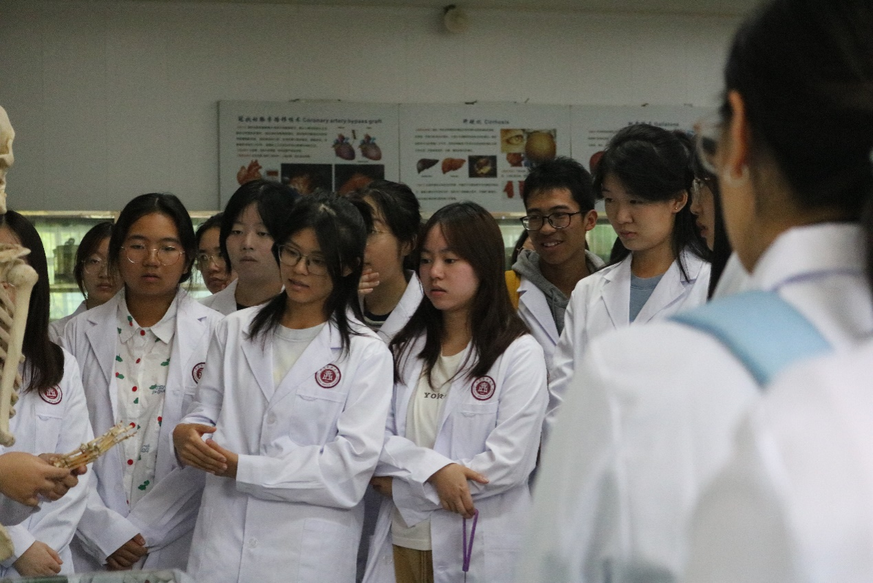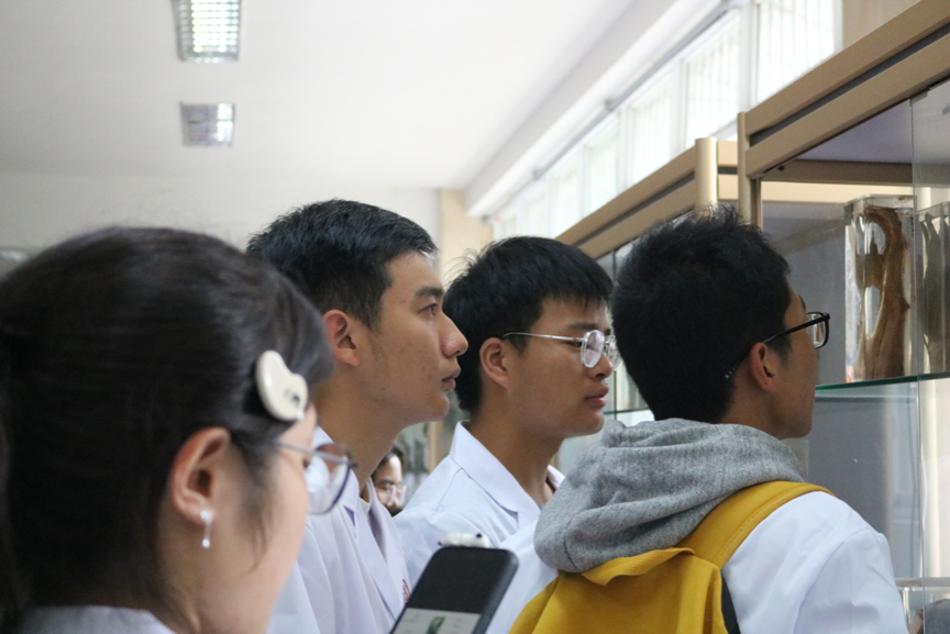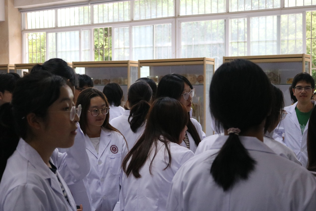 下午三时,新生们在讲解员及助班的带领下有序入馆,庄严肃穆的氛围瞬间感染全场。馆内,从精密的骨骼肌肉系统、纵横交错的血管神经网络,到留存疾病痕迹的病理标本,每一件展品都无声诉说着生命的伟大与脆弱。同学们凝神聆听讲解,不时低声交流,眼神中满是对医学知识的渴求,更饱含对捐献者“大体老师”的崇高敬意。