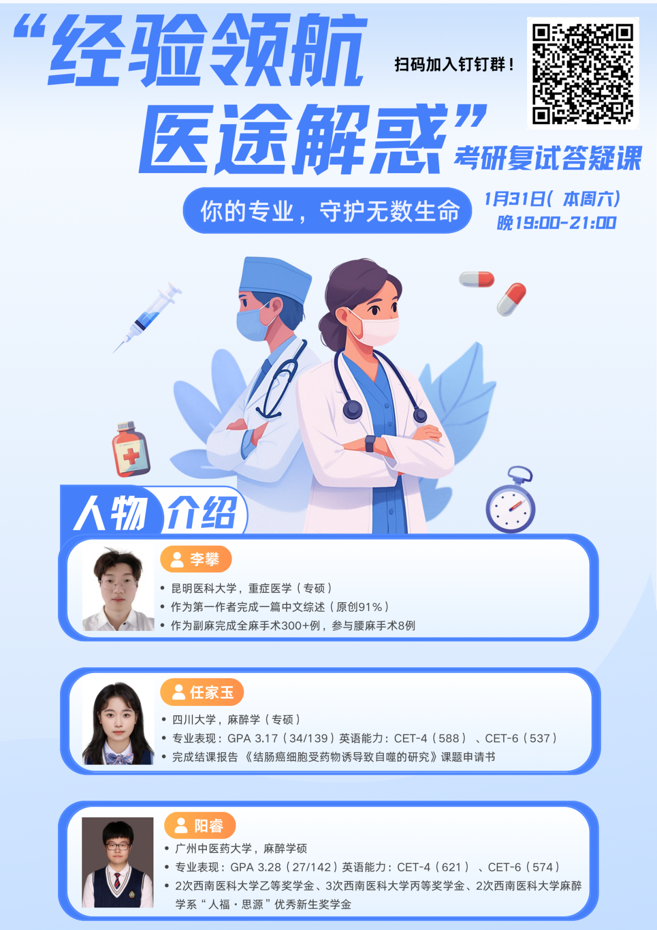 为助力2021级学子高效备战研究生复试,明确备考方向、掌握实战技巧、缓解备考焦虑,麻醉学系于1月31日举办了2026年考研复试线上经验分享会。本次分享会特邀三位考入四川大学等知名院校的麻醉学系优秀毕业生担任嘉宾,围绕复试全流程展开深度交流,吸引了全系众多备战复试的学子踊跃参与。