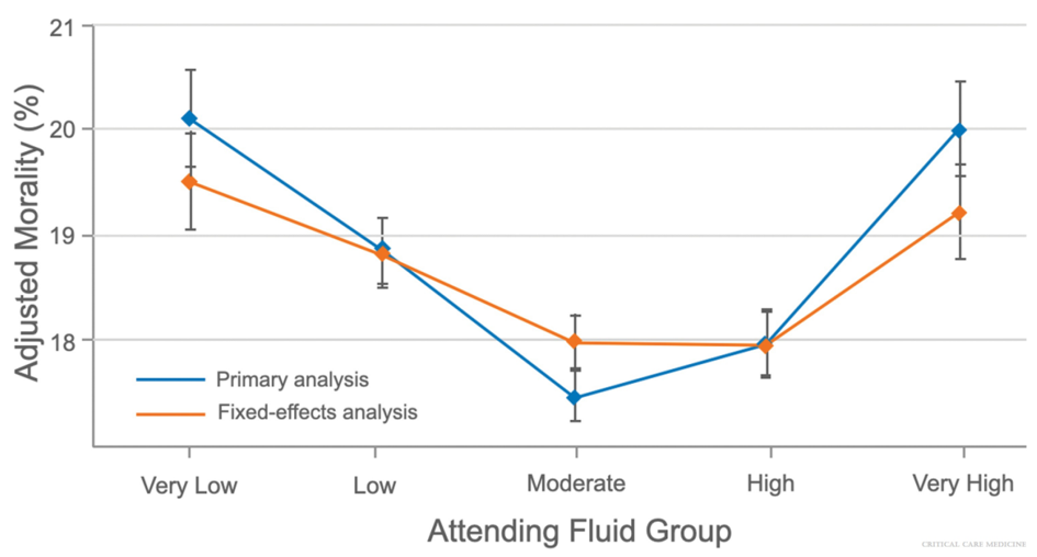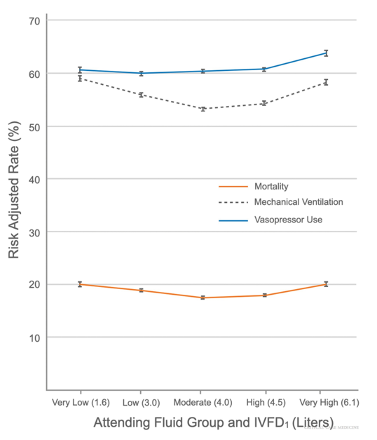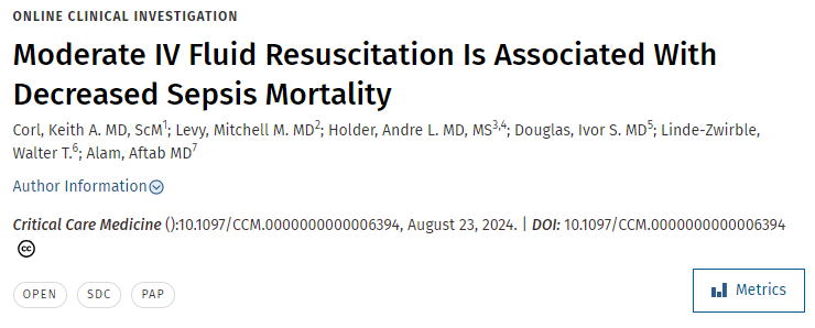 Corl KA, Levy MM, Holder AL, Douglas IS, Linde-Zwirble WT, Alam A. Moderate IV Fluid Resuscitation Is Associated With Decreased Sepsis Mortality. Crit Care Med. Published online August 23, 2024. doi:10.1097/CCM.0000000000006394