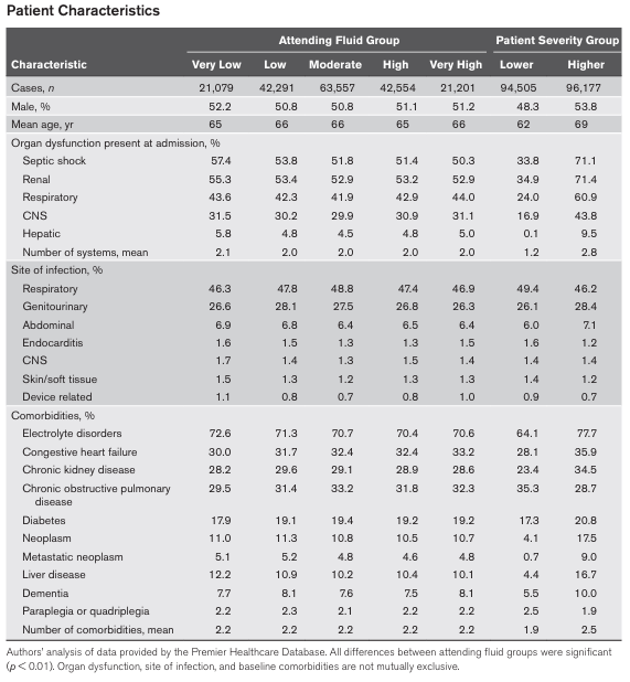 研究样本包括190,682例败血症(47%)和感染性休克(53%)入院患者,由美国612家医院的24,445名主治医生管理。基线患者特征在液体组之间相似(表1)。与低严重程度组相比,高严重程度组患者脓毒性休克、器官功能障碍和恶性肿瘤的发生率更高。