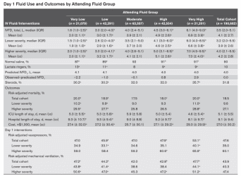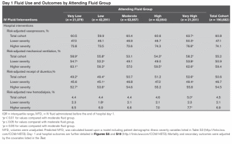本研究利用Premier Healthcare数据库对患有脓毒症和脓毒性休克患者的医生和医院补液复苏实践进行了研究。结果发现,尽管基线患者特征预测患有脓毒症的患者在第1天应接受相对狭窄的平均静脉液体范围(95%范围,3.6-4.5升),但在实践中他们接受了更宽的范围(95%范围,1.7-7.4升)。我们的研究结果表明,由平均给予中等剂量IVFD1(4.0升;IQR,2.4-5.1升)的医生治疗的患者与死亡率降低有关。中等剂量的IVFD1还与机械通气率、血管加压药使用率和新开始血液透析率降低有关。与当前的建议相反,即早期开始使用血管加压药,以及普遍采用早期使用血管加压药以减少复苏液体量的做法,尽管低剂量组的死亡率较高,但我们没有观察到对血管加压药的使用增加。这可能反映了临床管理不当的一个方面,因为有意采用低液体复苏策略的医生通常会通过补充血管加压素来达到平均动脉压复苏目标。在对患有基础心脏病、终末期肾病和肺高压的患者进行的亚组分析中,采用2至3升IVFD1进行复苏与采用较低或较高IVFD1进行复苏相比,与死亡率降低有关。这与之前的研究结果一致,该研究表明,患有先天性心脏病和肾功能衰竭的感染患者在实施要求静脉输液剂量为30毫升/公斤的感染综合治疗方案后,死亡率降低。最后,一项考虑了医院内和医院间差异的分析发现,观察到的IVFD1变化中的大部分可归因于医院内医生行为的变化。医生的行为,无论患者的特征是否触发了静脉输液复苏或导致停止静脉输液,都解释了观察到的IVFD1实践变化中的大部分差异。