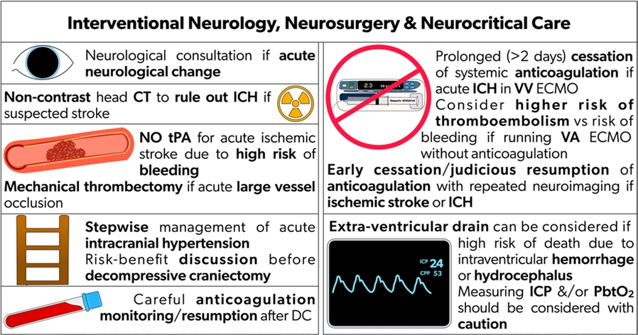 图3关于ECMO的介入神经病学、神经外科和神经重症监护的建议。CT:计算机断层扫描;ECMO:体外膜氧合;ICH:脑出血;ICP:颅压;PbtO2:脑组织氧合;tPA:组织纤溶酶原激活物;VV:静脉静脉;VA:静脉动脉。