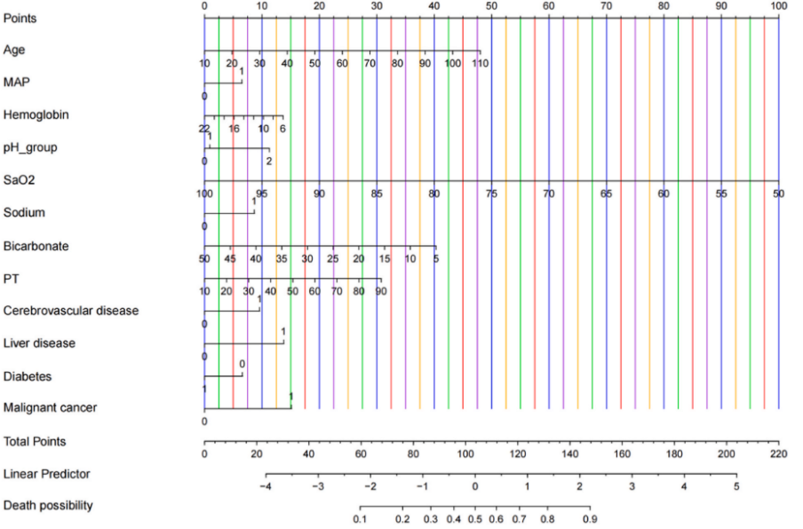 年龄是该模型中的一个关键因素,许多研究已确定它是脓毒症合并ARDS患者预后的独立危险因素。高龄与器官储备减少和对感染的易感性增加有关。在老年患者中,即使是轻微的损伤也会导致免疫功能障碍,有可能加剧ARDS和多器官功能障碍综合征(MODS)的发展,导致临床结局恶化和死亡率增加。