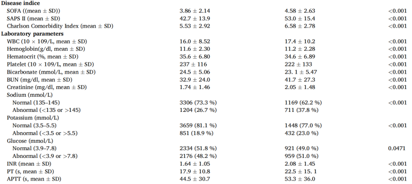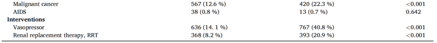 在我们的研究中,脑血管疾病、肝病、糖尿病、恶性肿瘤以及需要血管升压剂支持或RRT的患者的预后明显更差。据报道,脓毒症合并ARDS和具有基础疾病患者预后较差,死亡率较高。有三种或三种以上的基础疾病和高龄被确定为预后不良的独立危险因素。老年人和多种基础疾病的存在大大增加了脓毒症患者的死亡风险。