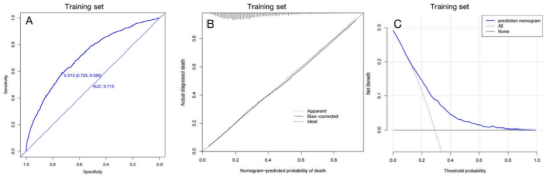 图4新开发的临床预测模型的性能评价A-C分别代表训练集的ROC分析、校准曲线分析和DCA。D-F分别代表内部验证集的ROC分析、校准曲线分析和DCA
