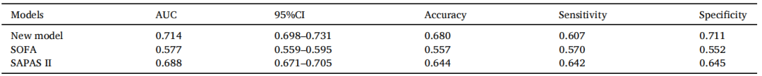 图5将新开发的预测模型与SOFA和SAPS II的判别性能进行比较;新模型的AUC值为0.715,而SOFA的AUC值为0.577,SAPS II的AUC值为0.688。