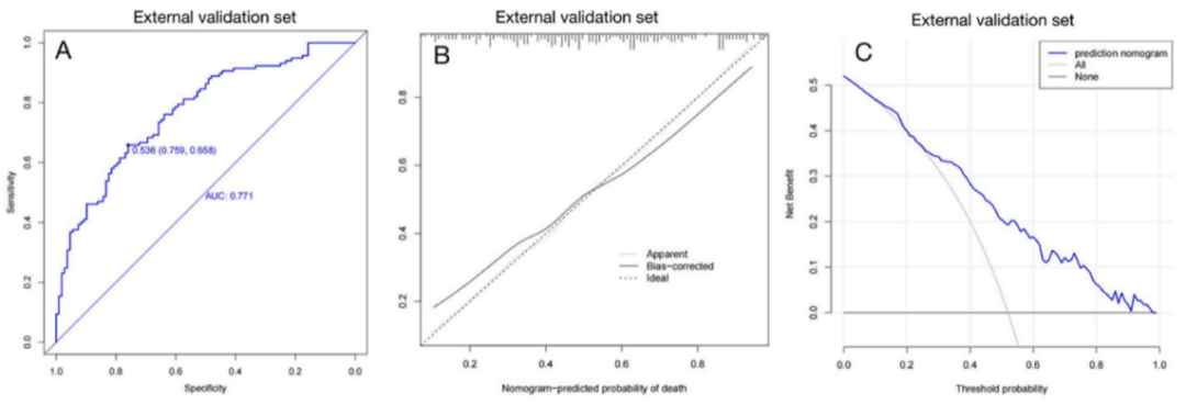 除了使用MIMIC IV数据作为训练和内部验证集外,我们还收集了中国辽宁省三级医院脓毒症所致ARDS患者的数据用于外部验证新开发的预测模型,该数据集包括2016年1月至2022年9月期间符合入选和排除标准并提供完整信息的225例患者。在这些患者中,117例在住院期间死亡,108例存活。如图6所示,结果表明该模型显示出良好的临床区分,在外部验证集中AUC为0.771(图6A)。此外,该模型表现出良好的校准(图6 B)、临床适用性和净效益(图6C)。