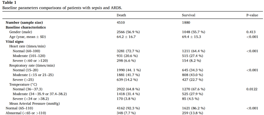 表1脓毒症并发ARDS患者的基线参数比较