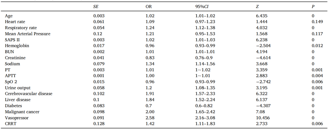 表2脓毒症并发ARDS患者预测因素的多因素logistic回归分析