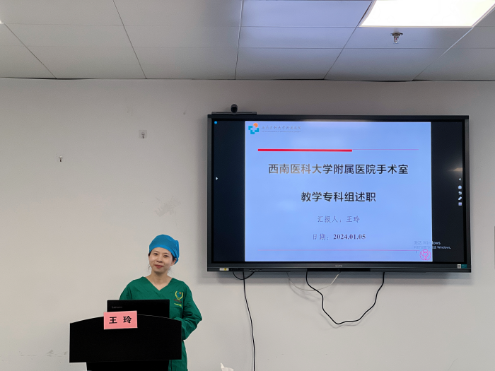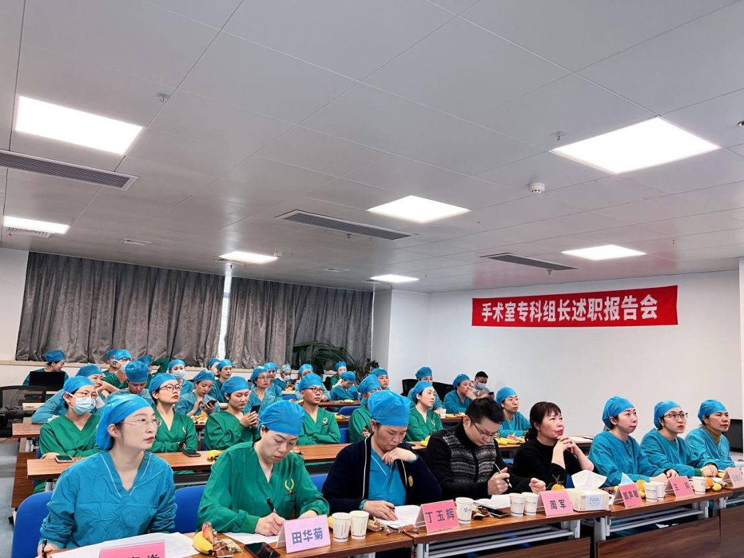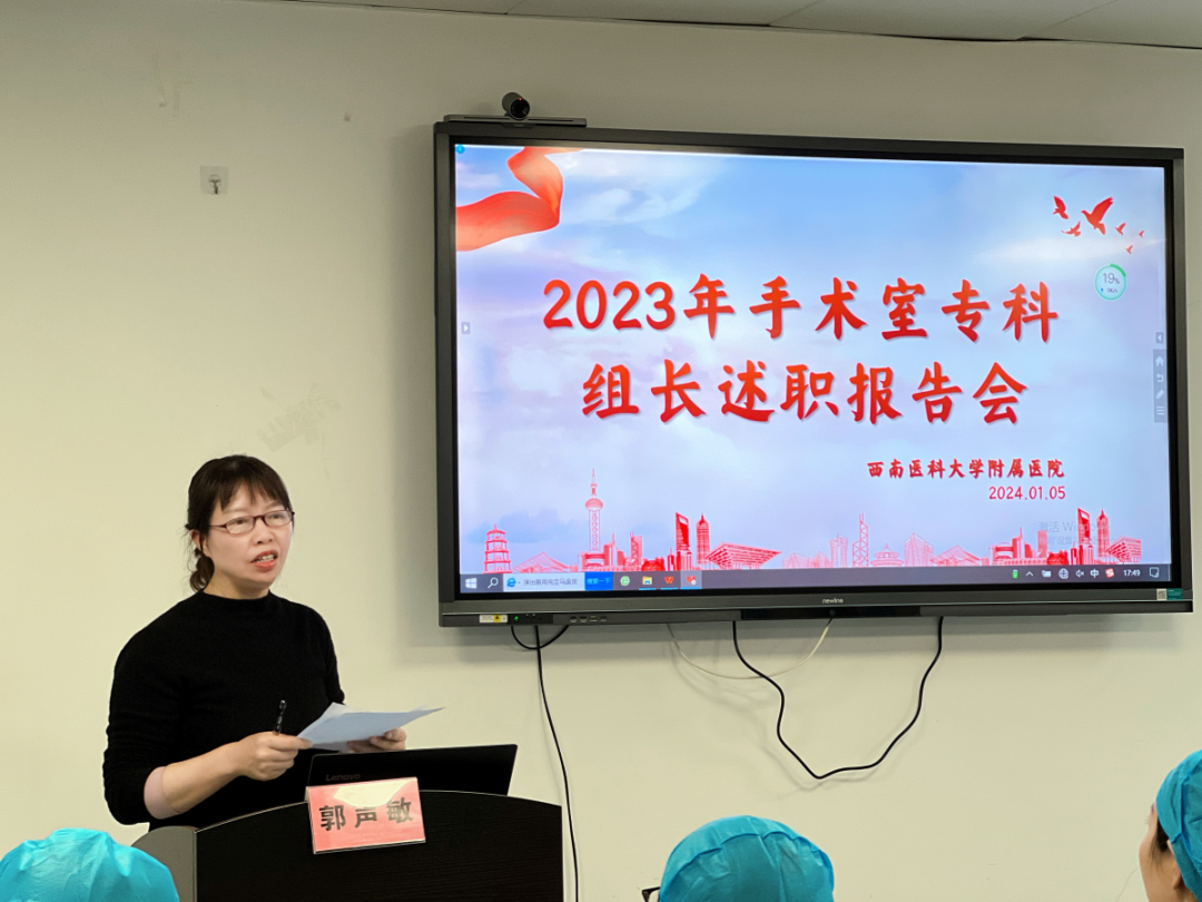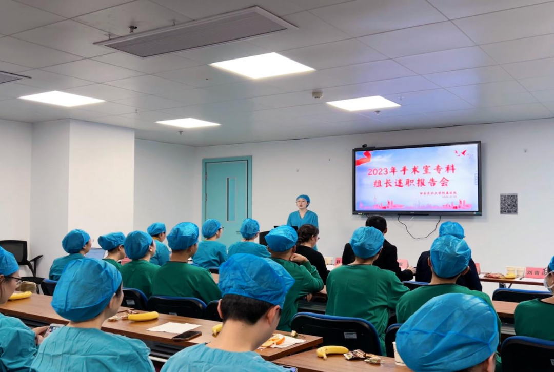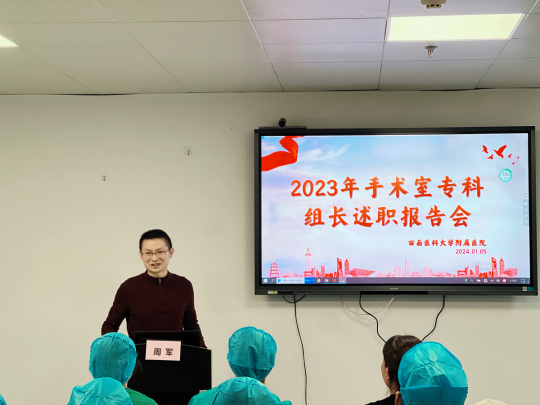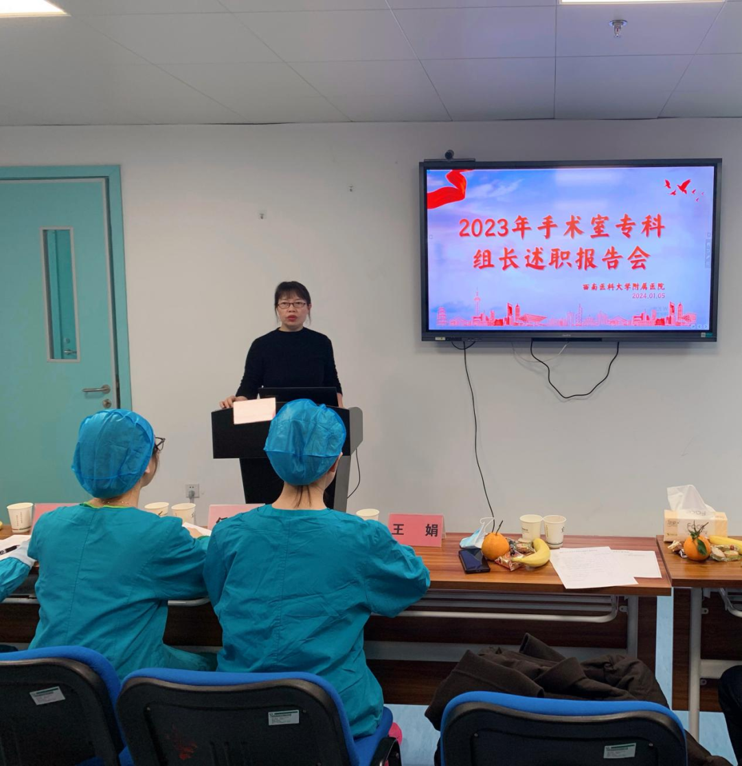2024年1月5日,西南医科大学附属医院手术室召开2023年度专科组长述职报告会。会议由手术室副护士长刘青焱主持,护理部主任郭声敏主任护师、麻醉科主任周军教授、第41党支部书记丁玉辉、第83党支部书记梅燕、麻醉科副护士长王娟、任建兰及手术室骨干40余人参加。