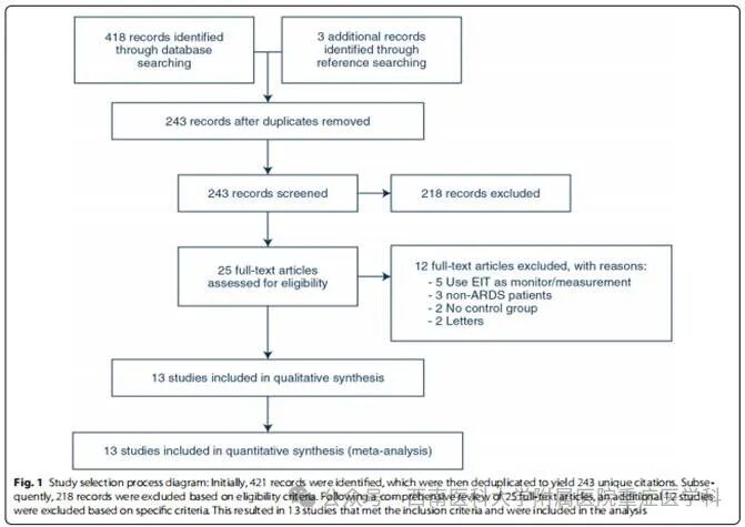 通过数据库检索共获得421条文献记录,剔除重复后保留243项独立研究。经标题/摘要初筛排除218项不符合纳入标准的研究后,对25篇全文进行深度评估,最终排除12项研究(排除原因包括:仅用EIT监测肺功能、纳入非ARDS人群、缺乏对照组或关键数据缺失),最终纳入13项研究(共623例患者)进行Meta分析(图1)。