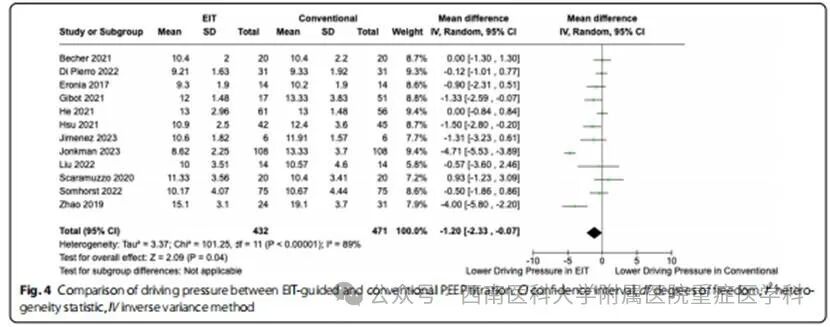 肺顺应性:12项研究(n=941)显示,EIT组较传统方法显著提升肺顺应性(MD=4.33,95% CI [2.94, 5.71],P<0.00001,I²=0%)(图2)。机械功与驱动压:EIT组机械功显著降低(n=148,MD=−1.99,95% CI [−3.51, −0.47],P=0.01,I²=0%),驱动压亦下降(n=903,MD=−1.20,95% CI [−2.33, −0.07],P=0.04,I²=89%)(图3、图4)。PEEP与平台压:两组间差异无统计学意义,但存在显著异质性。