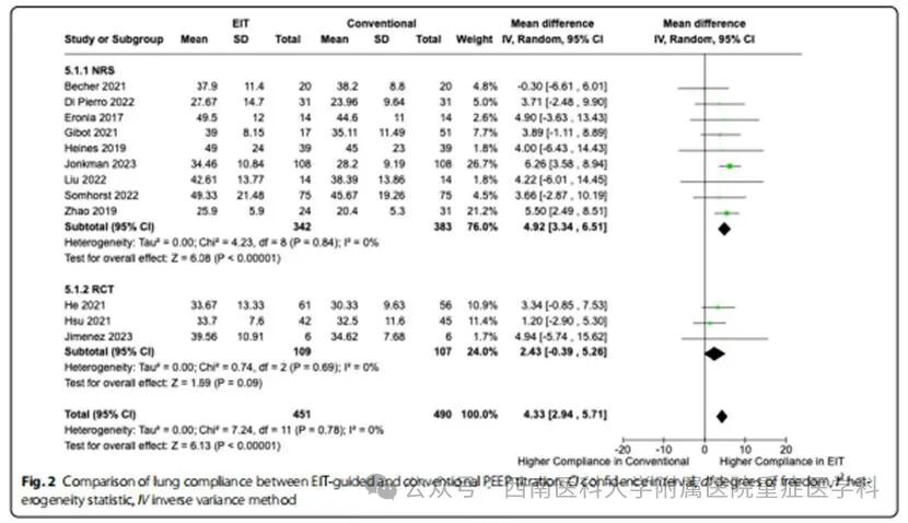 此外,EIT引导的PEEP调整还显著降低了机械功率和驱动压力,这可能对减少呼吸机相关的肺损伤(VILI)具有重要意义。降低机械功率和驱动压力可能为ARDS患者带来潜在的生存优势。尽管我们没有发现EIT引导的PEEP调整对PaO2/FiO2比值、ICU停留时间和%COV有显著影响,但在三项研究中,我们观察到与肺顺应性和驱动压力改善相关的死亡率降低趋势。