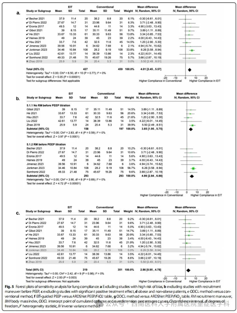随机对照试验(vs NRS)的敏感性分析一致表明,EIT引导的PEEP对肺顺应性改善有积极作用。合并(MD)为2.43(95%CI−0.39至5.26),表明有改善的趋势,但估计值存在一些不确定性(图2)。为了进一步评估这些发现的稳健性,进行了额外的分析:排除具有高偏倚风险的研究,证实了治疗效果的一致性(M D = 4 . 0 1,9 5 % C I [ 2 . 4 5 , 5 . 5 7 ] ,P<0.00001,I2=0%),增强了结果的可靠性(图5a);在PEEP试验之前,通过排除肺复张策略的研究,将EIT引导的PEEP的影响与潜在的混杂因素隔离开来,仍显示出积极的趋势(MD=3.85,95% CI[ 1.95,5.75],P<0.0001 ,I2=0%),从而加强了EIT指导的PEEP对肺顺应性的直接影响(图5b);去除具有显著积极治疗效果的研究表明,总体积极趋势不仅仅是由少数异常研究驱动的,因为对肺顺应性的影响始终是积极的,具有统计学意义( MD=2.86 ,95%CI[0.95,4.78] ,P=0.003 ,I2=0%)(图5c)。我们对肥胖患者亚组进行了敏感性分析,以检验EIT引导的PEEP可能对这一特定亚组特别有利的假设,因为他们有不同的呼吸问题,如肺水肿、非均一通气和VILI风险增加。然而,我们的研究结果表明,与常规PEEP方法相比, EIT引导的PEEP可以提高肥胖患者(MD=5.27,95%CI[3.22,7.33],P<0.00001,I2=0%)和非肥胖患者(MD=3.54,95%CI[1.66,5.41],P=0.0002,I2=0%)的呼吸系统顺应性(图5d)。我们进行了全面的检查,比较了不同的PEEP滴定策略:ODCL法与传统方法,EIT引导的PEEP与ARDSNet PEEP/FiO2表,ODCL法和ARDSNet PEEP/FiO2表。在将ODCL方法与常规方法进行比较时,我们观察到肺顺应性的MD为4.62(95%CI[3.10 ,6.14],P<0.00001,I2=0%)(图5e)。同样,当将EIT引导的PEEP与ARDS Net PEEP/FiO2表进行比较时,MD为3.17(95%CI[0.76,5.58],P=0.01,I2= 0% )(图5f)。