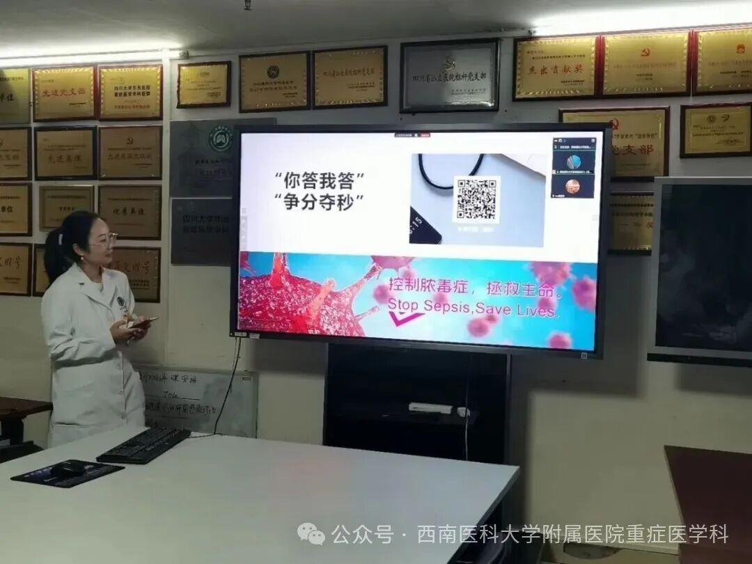 为迎接第14个“9·13国际脓毒症日”,9月12日上午,重症医学科在科室示教室组织开展以“识别脓毒症,分秒必争”为主题的专题培训活动。本次活动由科室胡丽蓉副教授统筹策划和主持,全体医护人员积极参与,并面向全院职工及患者家属开放。