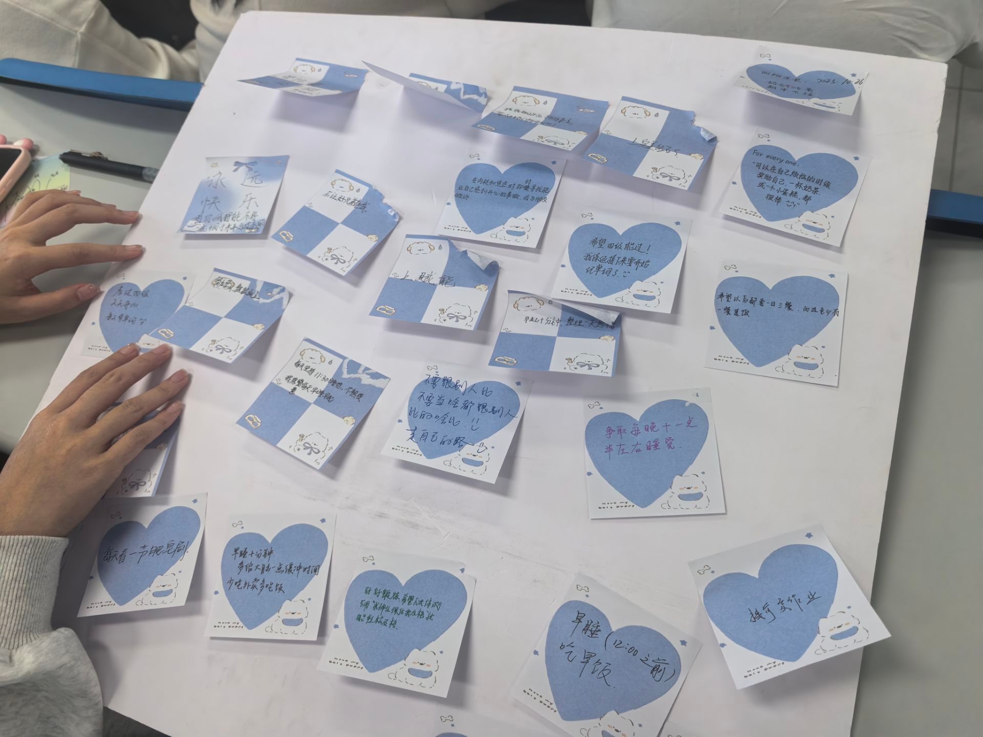 班会中,多班设计趣味破冰环节。“向阳盲盒”让同学们分享从容小事,从日常感知情绪变化;“节奏圆盘”绘制活动围绕学习、社交、休息与集体活动四大板块,探讨时间精力分配,寻找个人与集体的平衡,同学们在协作中思考,在表达中增进理解。部分班级将心理学理论融入互动。例如,通过“充电耗电行为评判”帮助同学们识别有益与消耗心理能量的习惯;借助“21天微充电模型”传递日常积累的重要性;用“自嘲接龙”等游戏助力情绪调节与认知重构。这些环节让抽象理论化为具体行动,同辈共鸣也为同学们的成长注入支持。