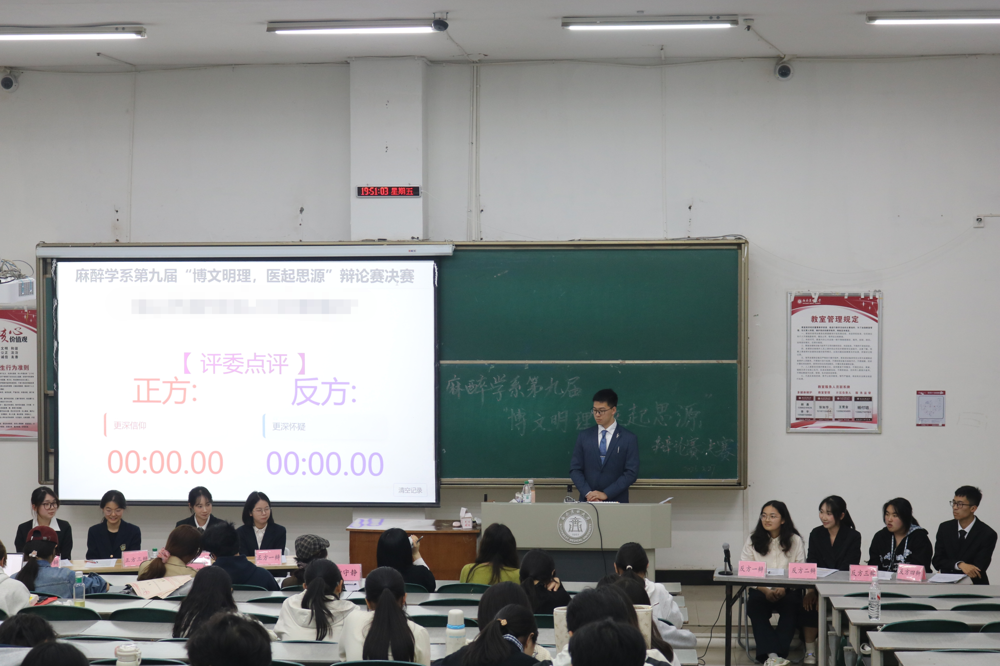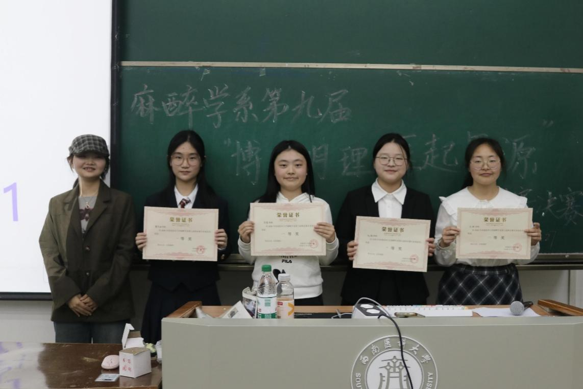 经过激烈比拼,由董思涵、赵琳、孔甜、余蓓组成的正方队伍荣获冠军。四位辩手立论严谨、配合默契,展现了麻醉学系学子扎实的逻辑素养与出色的表达能力,在思辨交锋中尽显青春风采。